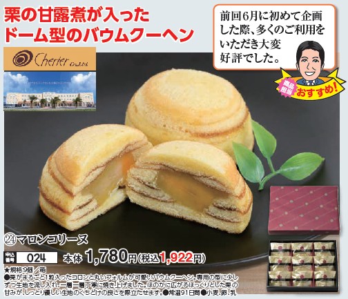 マロンコリーヌ」は、栗がまるごと1粒入った、コロンと丸いフォルムが可愛いバウムクーヘン。専用の型に少しずつ生地を流し入れ、一層一層丁寧に焼き上げました。